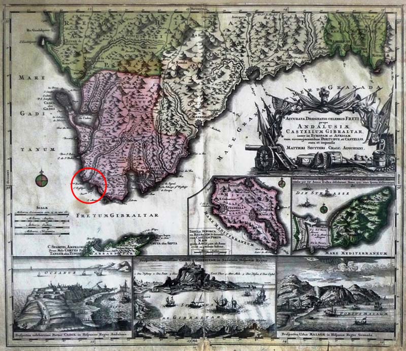 Mapa Cieśniny Gibraltarskiej z roku 1708; Przylądek Trafalgar zaznaczony jest czerwonym kółkiem