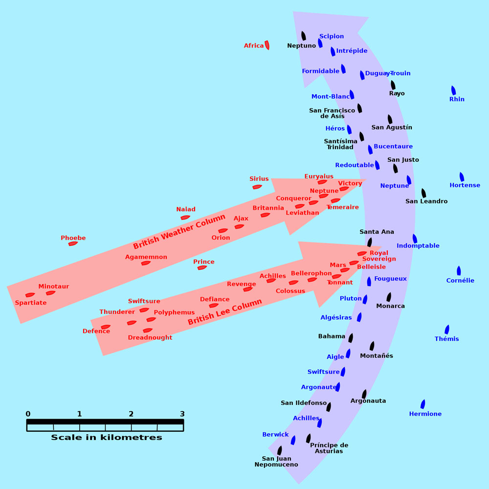 Gdy armada francusko-hiszpańska – zgodnie z ogólnie przyjętą tradycją bitew morskich – wyciągnęła się w jedną linię, zresztą nieco poprzerywaną, dwie kolumny brytyjskich okrętów wcięły się w nią z boku dwoma klinami.