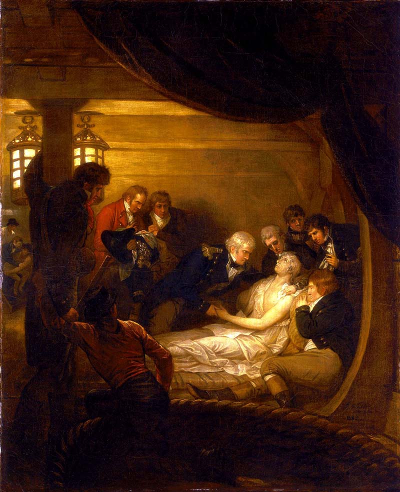 (The Death of Lord Nelson in the Cockpit of the Ship Victory; 1808; olej na płótnie; 88,5×73 cm; Royal Museums, National Maritime Museum, Greenwich, Londyn)