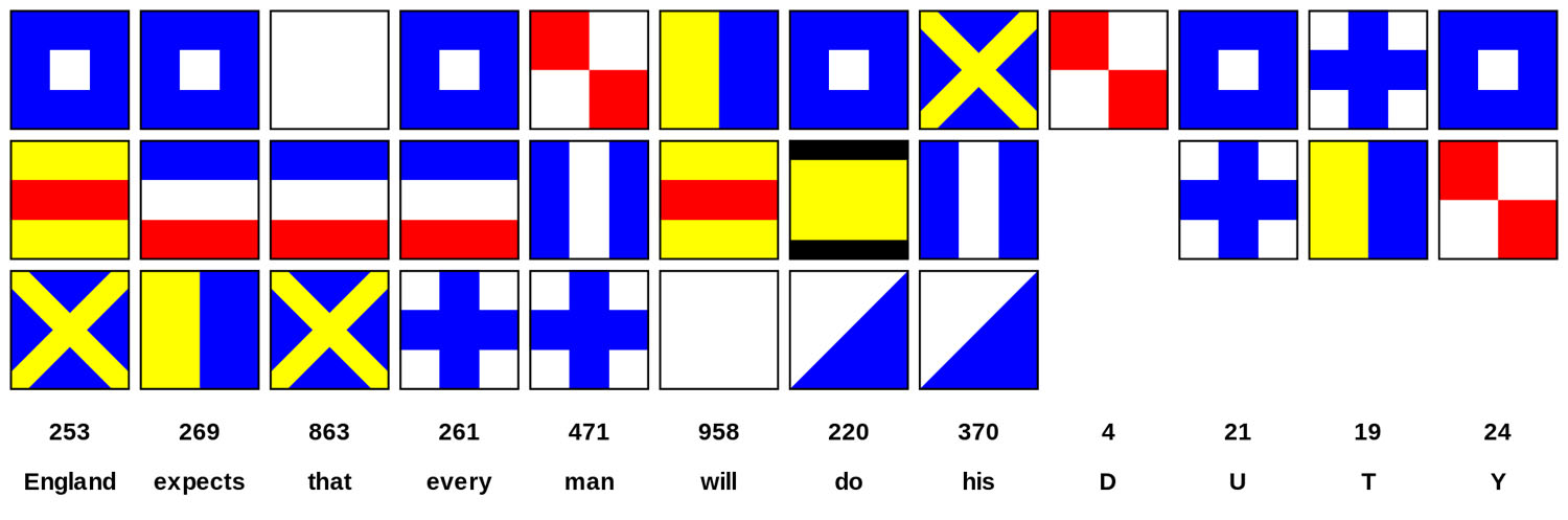 Początkowo Nelson chciał przekazać słowa England confides [ufa] that every…, ale sygnalista zwrócił mu uwagę, że w kodzie sygnałowym jest słowo expects [oczekuje], a nie ma confides i że drugie wymagałoby dłuższego nadawania każdej litery po kolei, co zajęłoby więcej czasu, a to ostatni moment przed bitwą. Ciekawe, że w kodzie sygnałowym nie było słowa duty i trzeba je było literować.