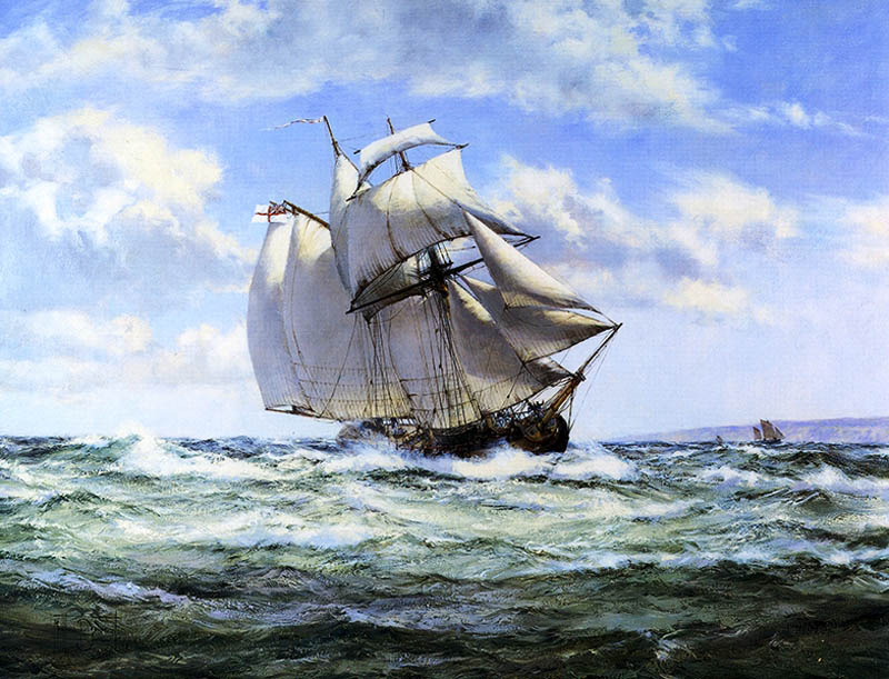 (News of Trafalgar – The Schooner Pickle; akwarela; 100×127 cm; źródło: Ron Ranson – The Maritime Paintings of Montague Dawson. Newton Abbot, UK : David & Charles, 1993)